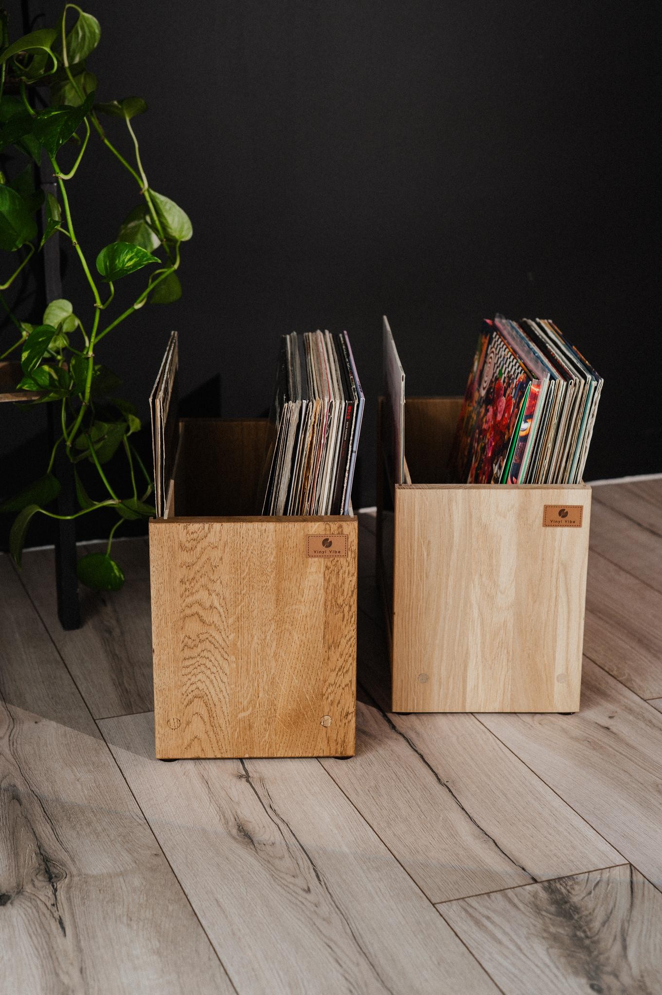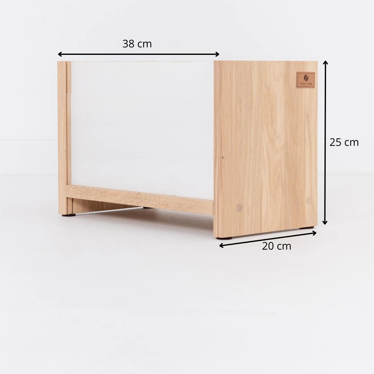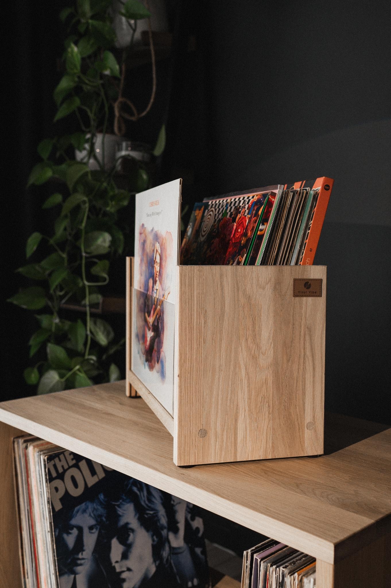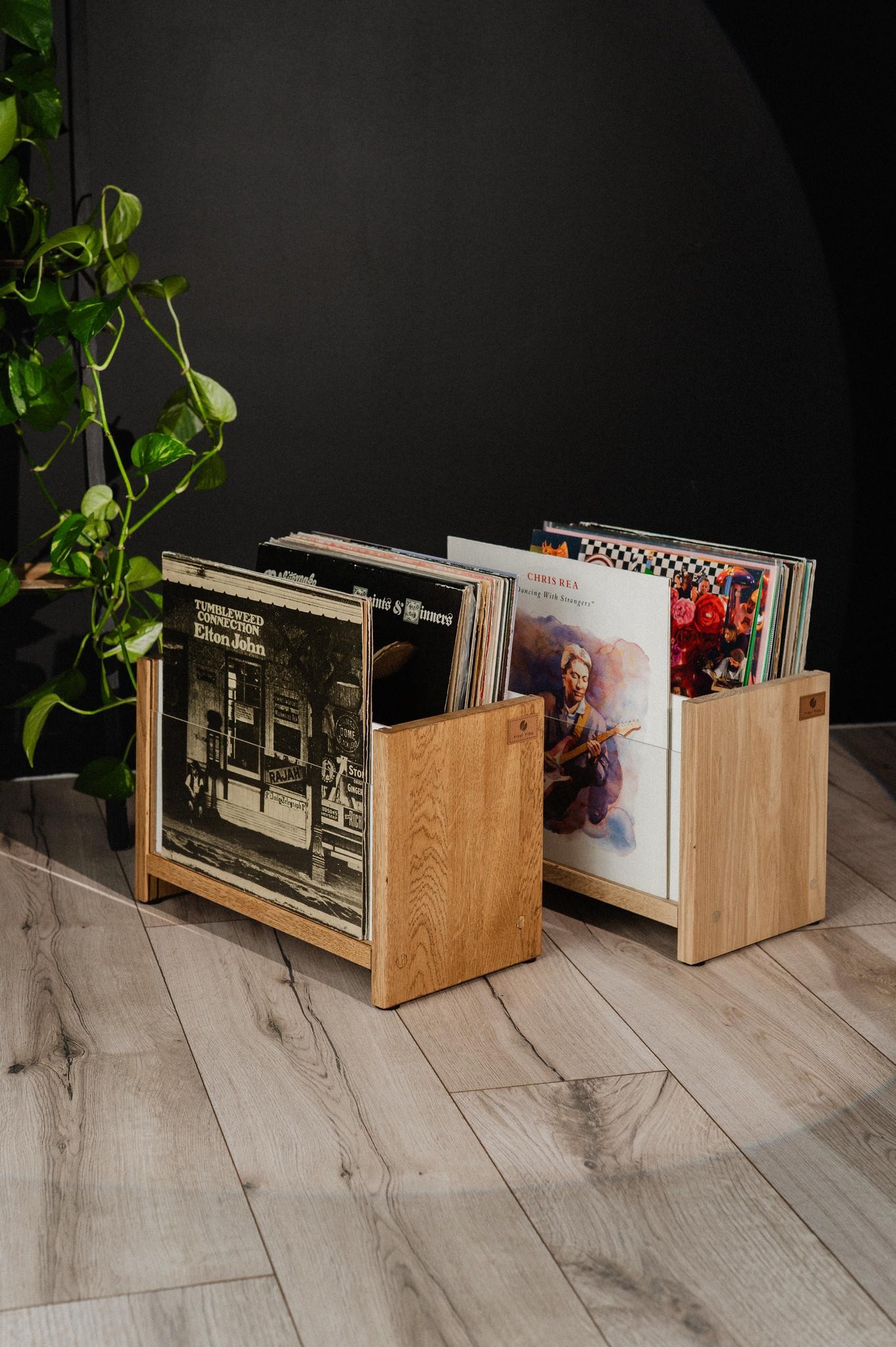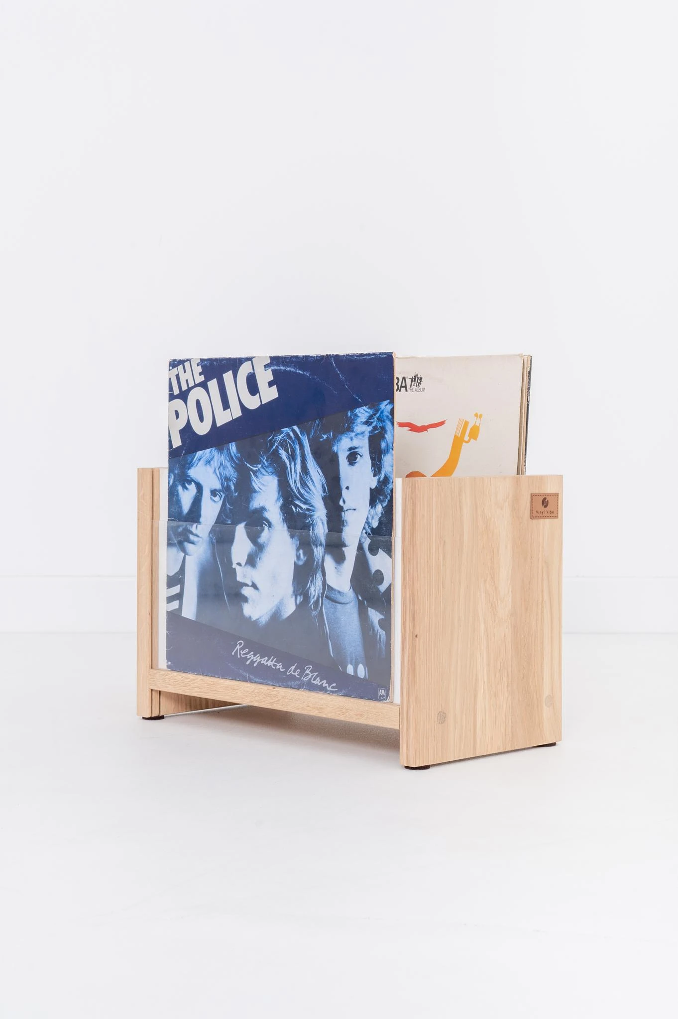 Stojak pomieści kilkanaście płyt winylowych i doskonale sprawdzi się zarówno jako samodzielny element dekoracyjny, jak i dodatek do szafki pod gramofon. Jego minimalistyczna forma i naturalne drewno dębowe idealnie wpisują się w nowoczesne oraz klasyczne aranżacje.