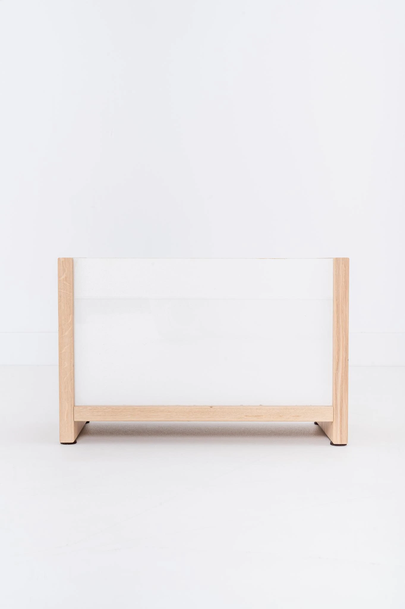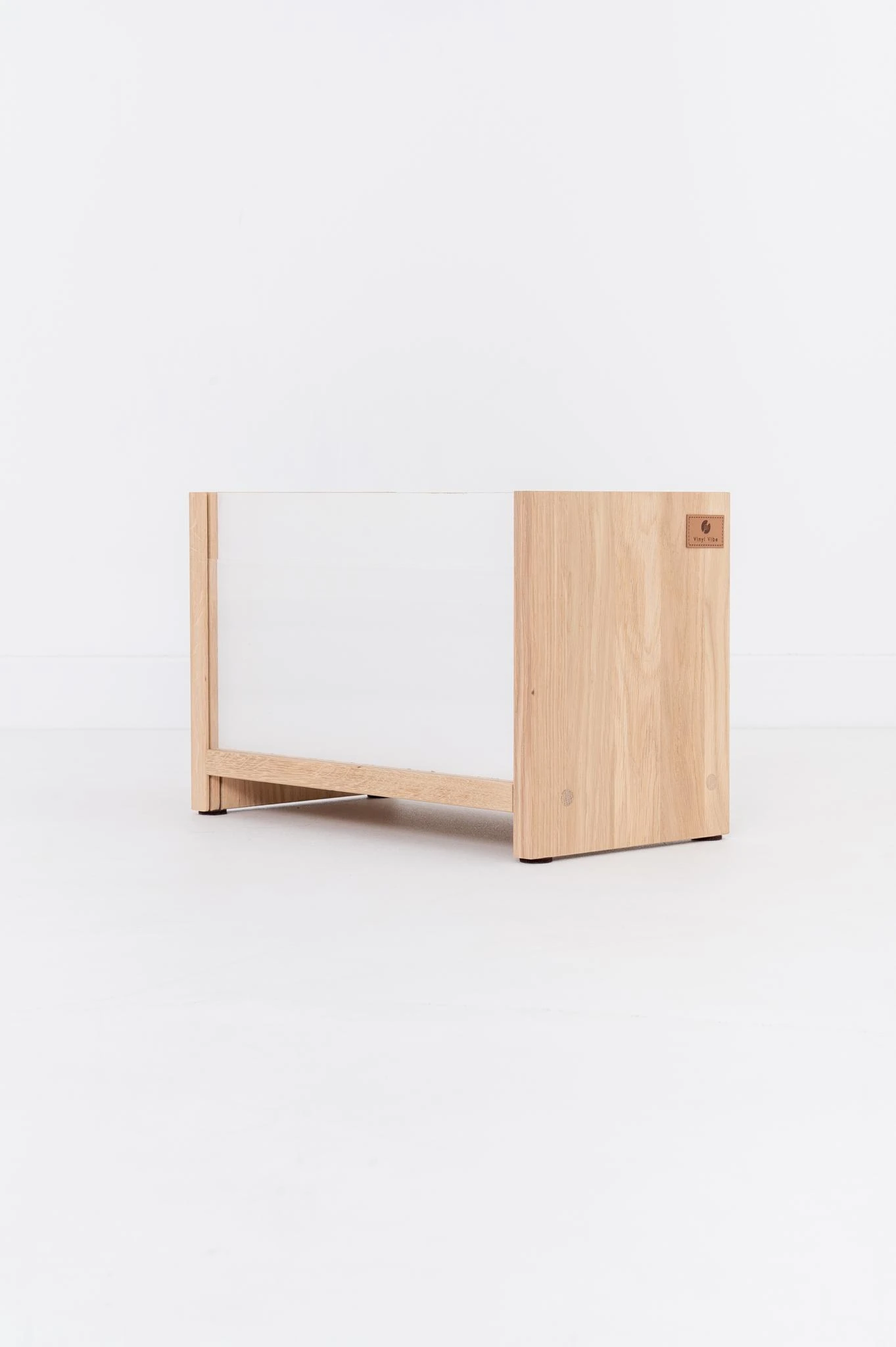 Stojak CLEAR została wykonana w całości z litego drewna dębowego, co gwarantuje trwałość, wytrzymałość i unikalny wygląd. Każdy egzemplarz jest niepowtarzalny dzięki naturalnemu rysunkowi drewna. Powierzchnia została zabezpieczona wysokiej jakości naturalnymi olejami, które podkreślają strukturę dębu, chronią drewno przed uszkodzeniami i nadają mu elegancki.